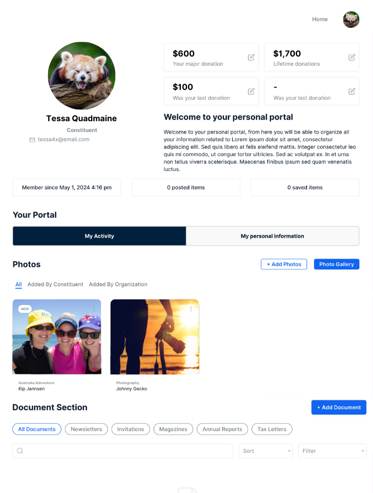 TrustyPortal empowers constituents and donors with easy access to relevant information. It functions as a central hub for all communication pertaining to them and their relationship to the organizations they support. TrustyPortal can host documents (including tax letters, newsletters, invitations, and solicitations), pictures, videos, and personal information, including gift history and impact. TrustyPortal will permanently archive information uploaded and act as a powerful engagement tool.